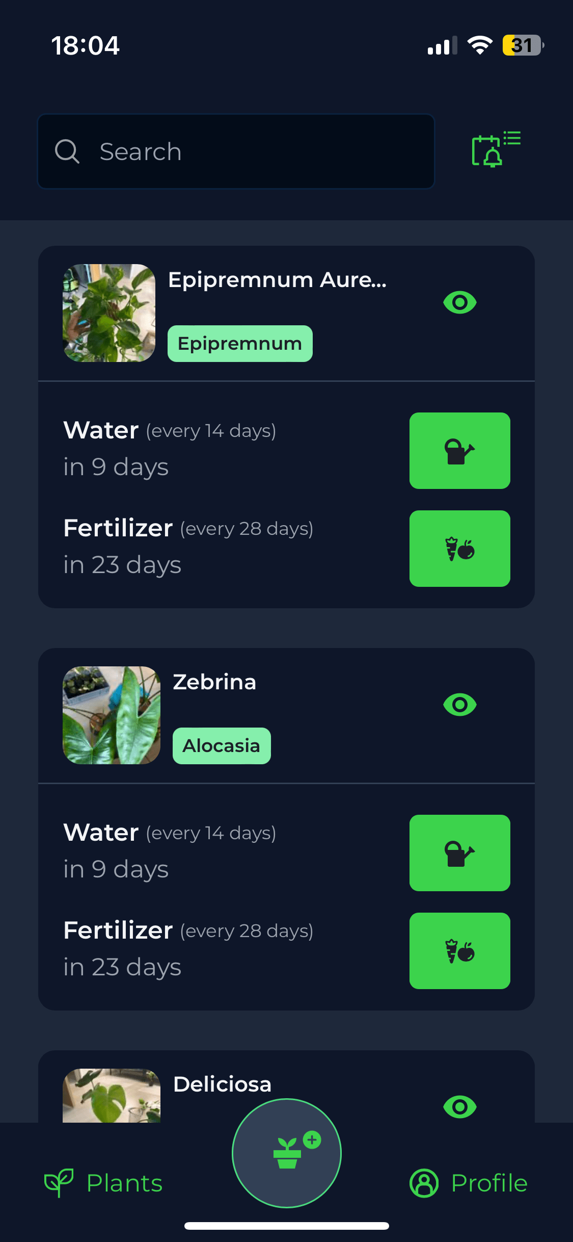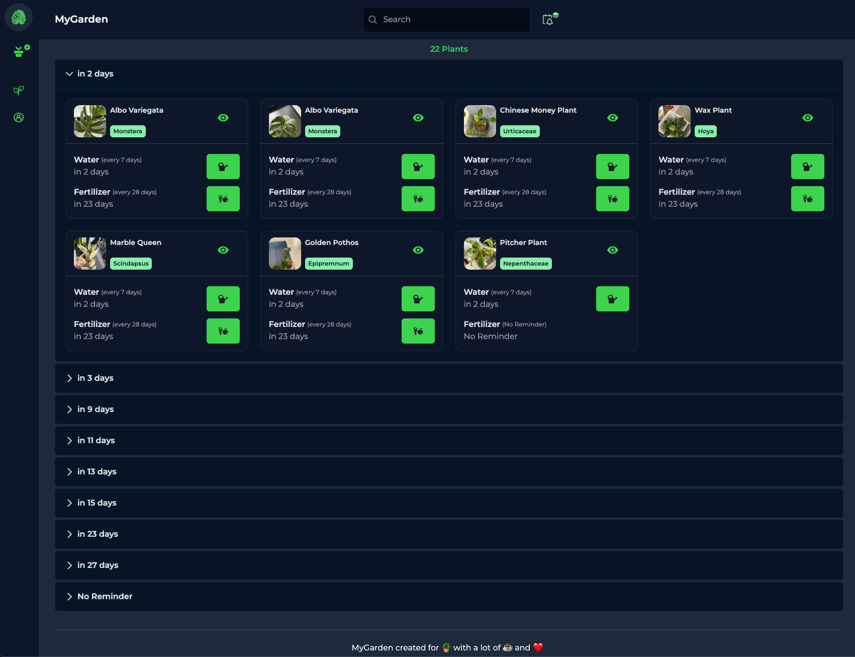Take the hassle out of keeping track of different watering and fertilizing schedules with MyGarden. Group your plants by the day you need to take action, making it easy to see what needs to be done and when.